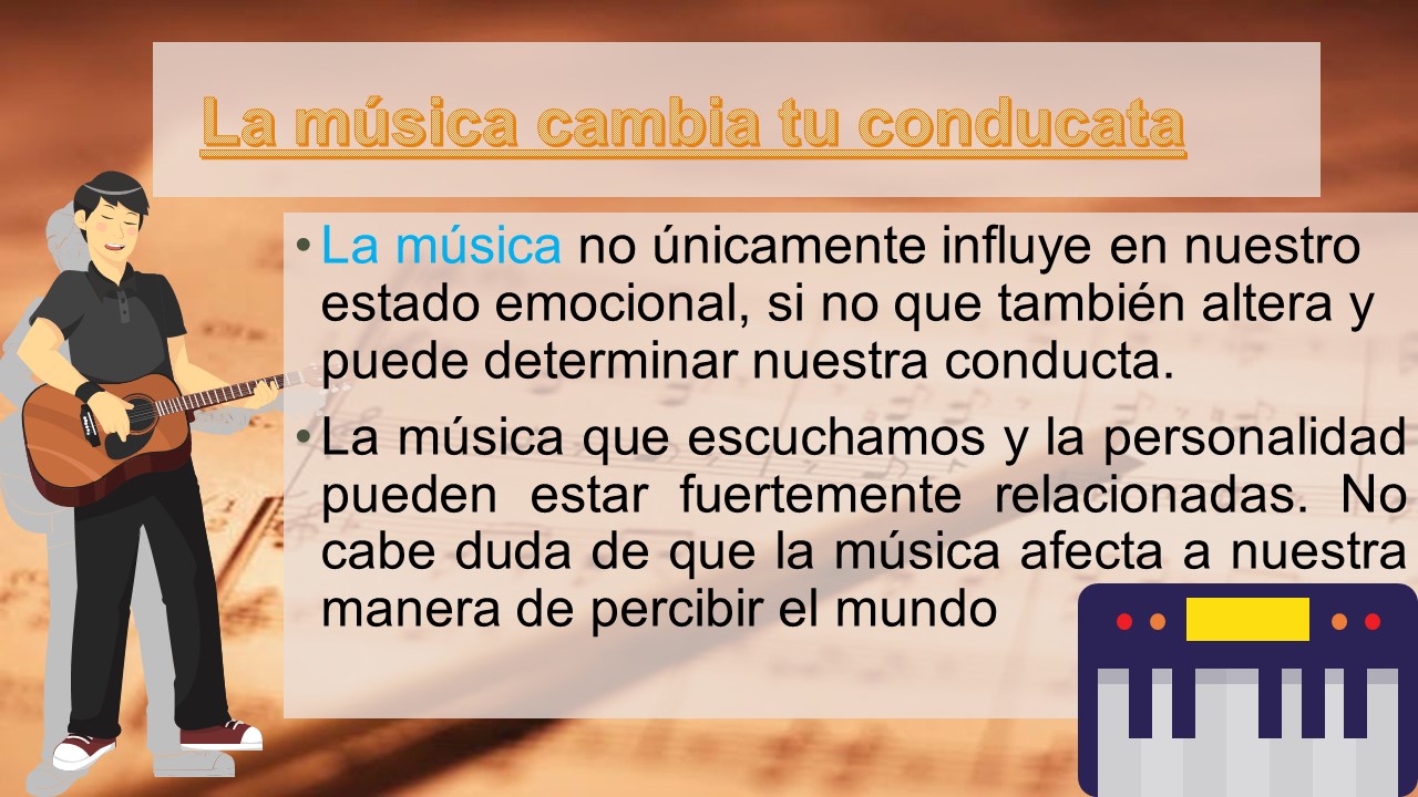 la música es la que nos acompaña en todo momento y en cualquier lugar es algo que nos conecta a todos. la música también es capaz de despertar emociones y estados de animo, la música es un lenguaje universal de comunicación muy profundo para la música no hay barreras ni distancia. llega a lo mas profundo de las personas y transfiere un sentimiento, la música estimula al cerebro para crear nuevas ideas, nos ayuda a hacernos sentir mejor aunque también puede hacernos sentir peor dependiendo de el tipo de música. por ejemplo, cuando escuchas una canción que es muy triste lo mas lógico es que te contagie ese sentimiento.